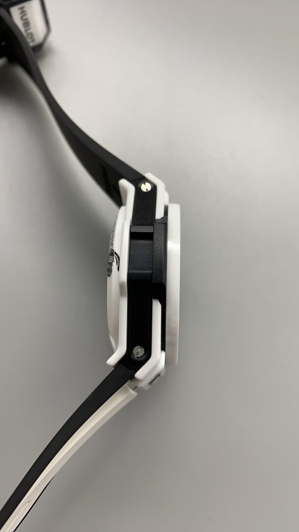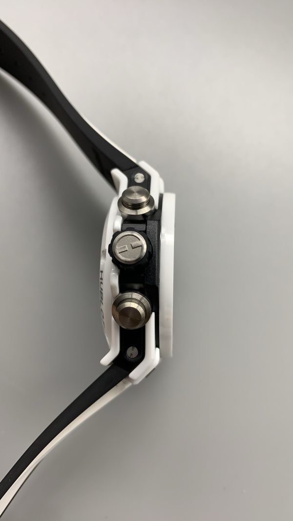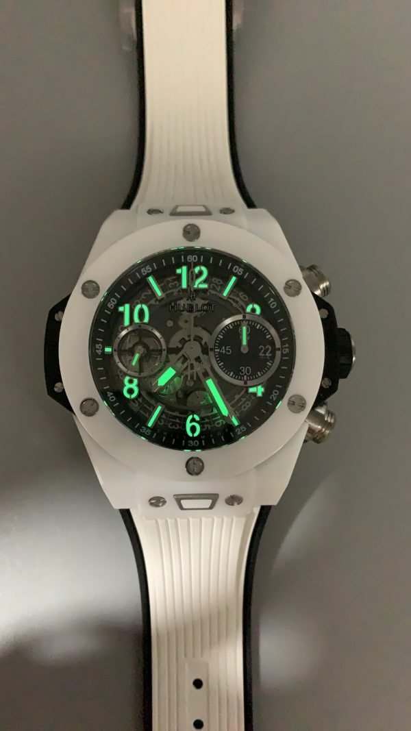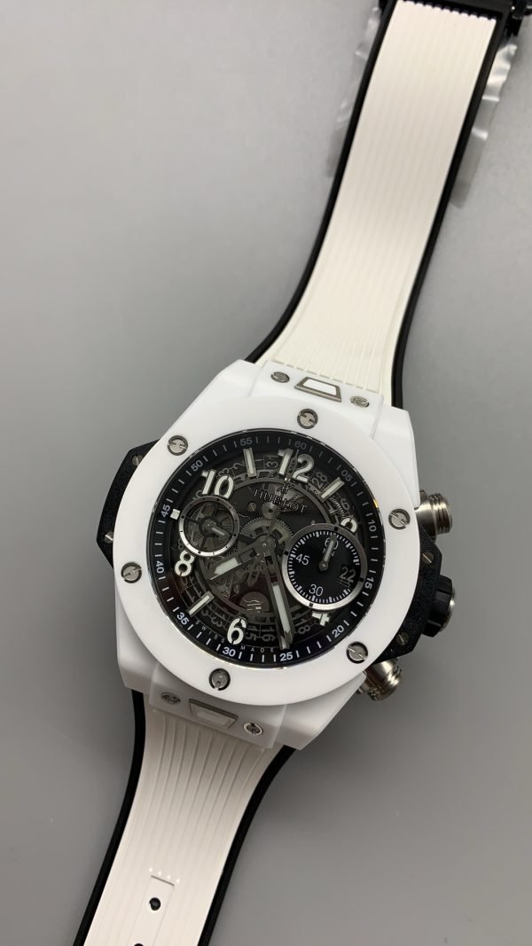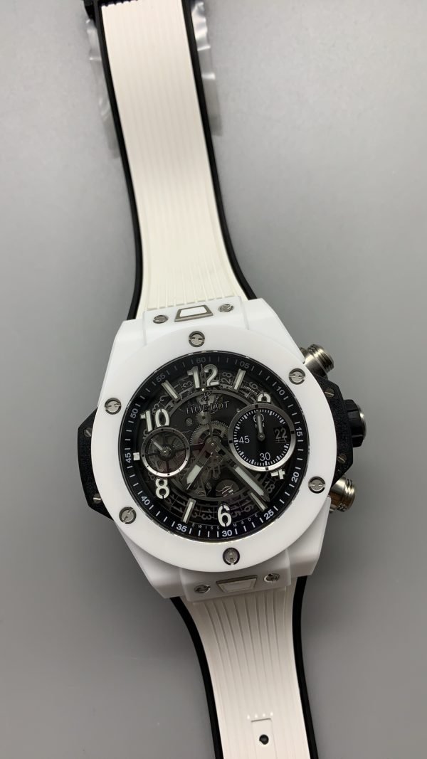 The wristwatch has a matching black and white rubber strap with a white ceramic and black-plated titanium deployment buckle clasp. Moreover, Hublot Big Bang Unico Super Clone is powered by the Swiss self-winding chronograph movement.