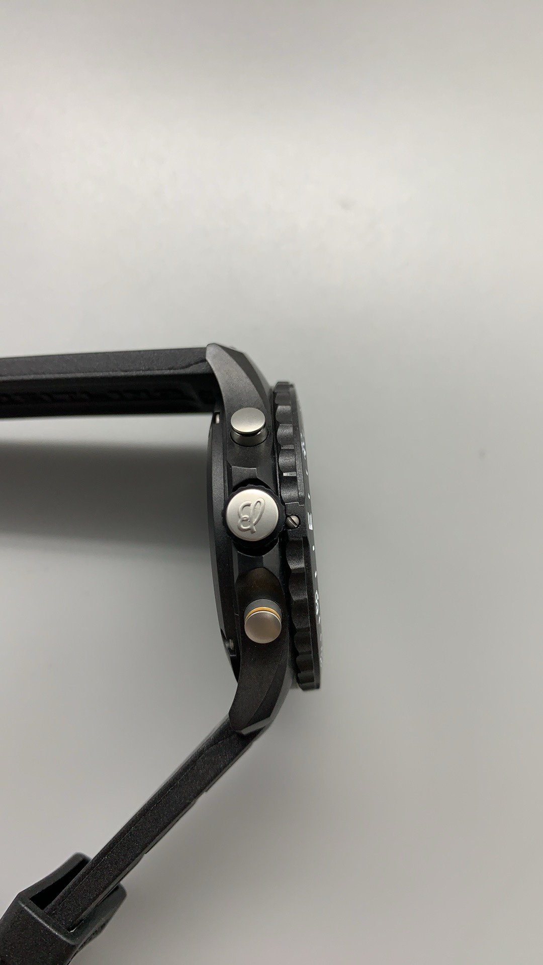 - Functions: Date window, Chronograph subdials: 1/10th of a second, 30-minute, and 12-hour counters, pulsometer, and compass bezel