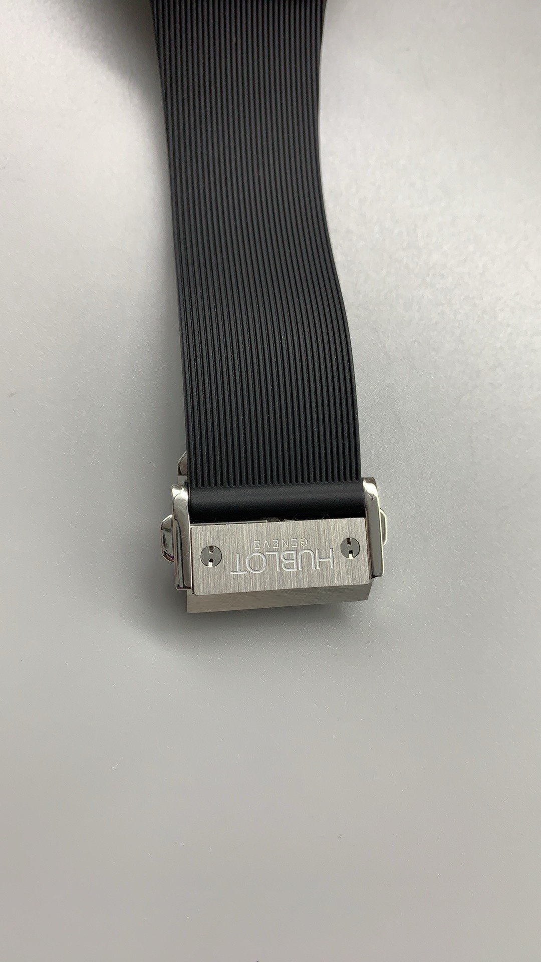 The 42mm Hublot Classic Fusion Racing Super Clone has a titanium case and bezel with a satin finish. Bezel also has the iconic 6 H-shaped titanium screws. The Super Clone has grey-lined rubber straps with a stainless-steel deployment buckle clasp.