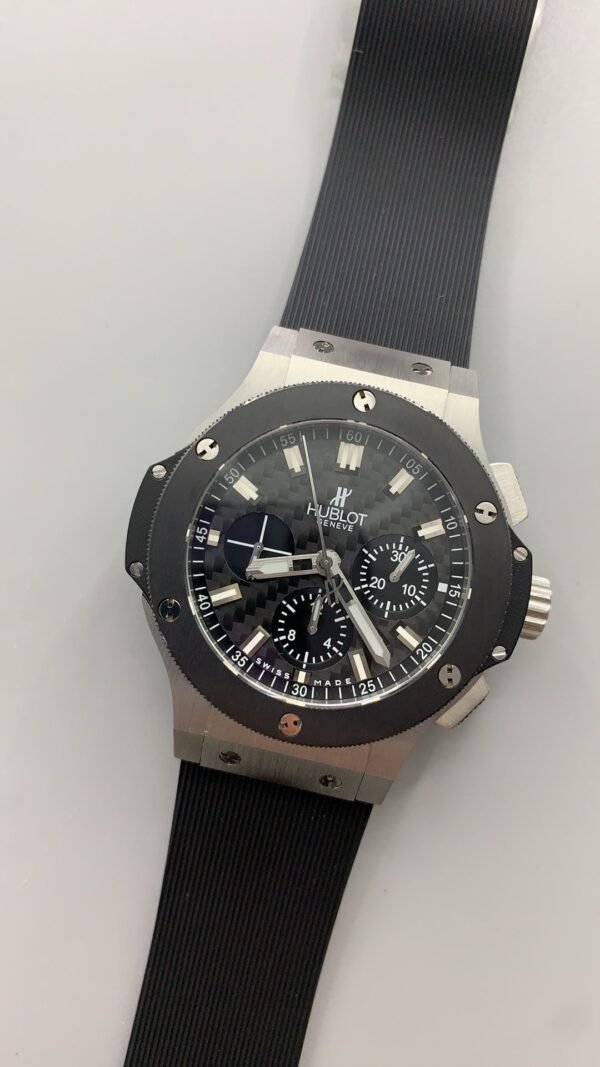 The stamped black dial has a carbon fiber effect giving a unique appearance to the Super Clone. Hublot Big Bang Super Clone has three chronograph subdials with luminescent baton hour markers. Watch with Chronograph subdials run on a Swiss self-winding chronograph movement. The Super Clone has a sapphire crystal transparent back and top for optimal protection.