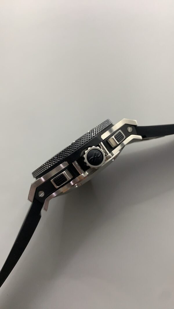 Hublot Big Bang 301.SM.1770.RX Super Clone is a 44mm satin-finished stainless-steel watch. The bezel is a polished black ceramic with 6 H-shaped titanium screws. Hublot Super Clone has black structured rubber straps with a stainless-steel deployment buckle clasp.