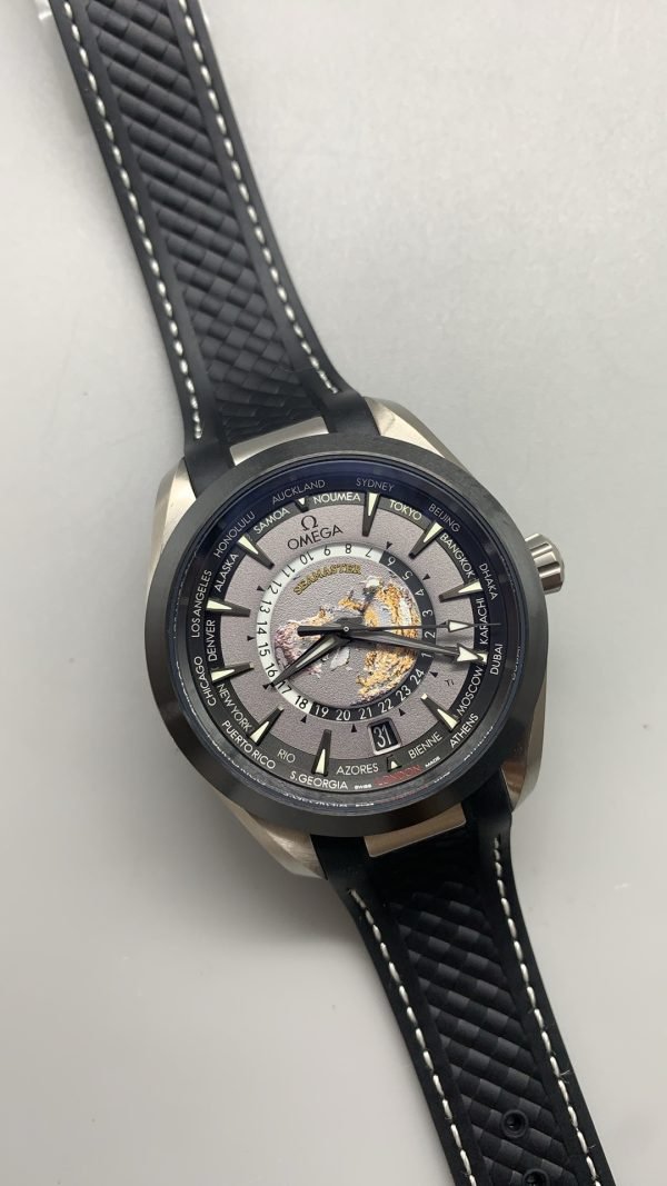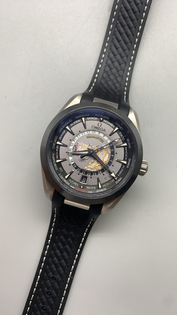Seamaster Aqua Terra Super Clone has a 43mm brushed titanium case and a black ceramic bezel. The Super Clone has a black and grey titanium dial. It is decorated with a vision of Earth viewed from the North Pole. The Omega Super Clone also has a 24-hour indication divided into night and day sections. You can find many global destinations circling between the luminescent indexes and the outer ring of the Aqua Terra Worldtimer.